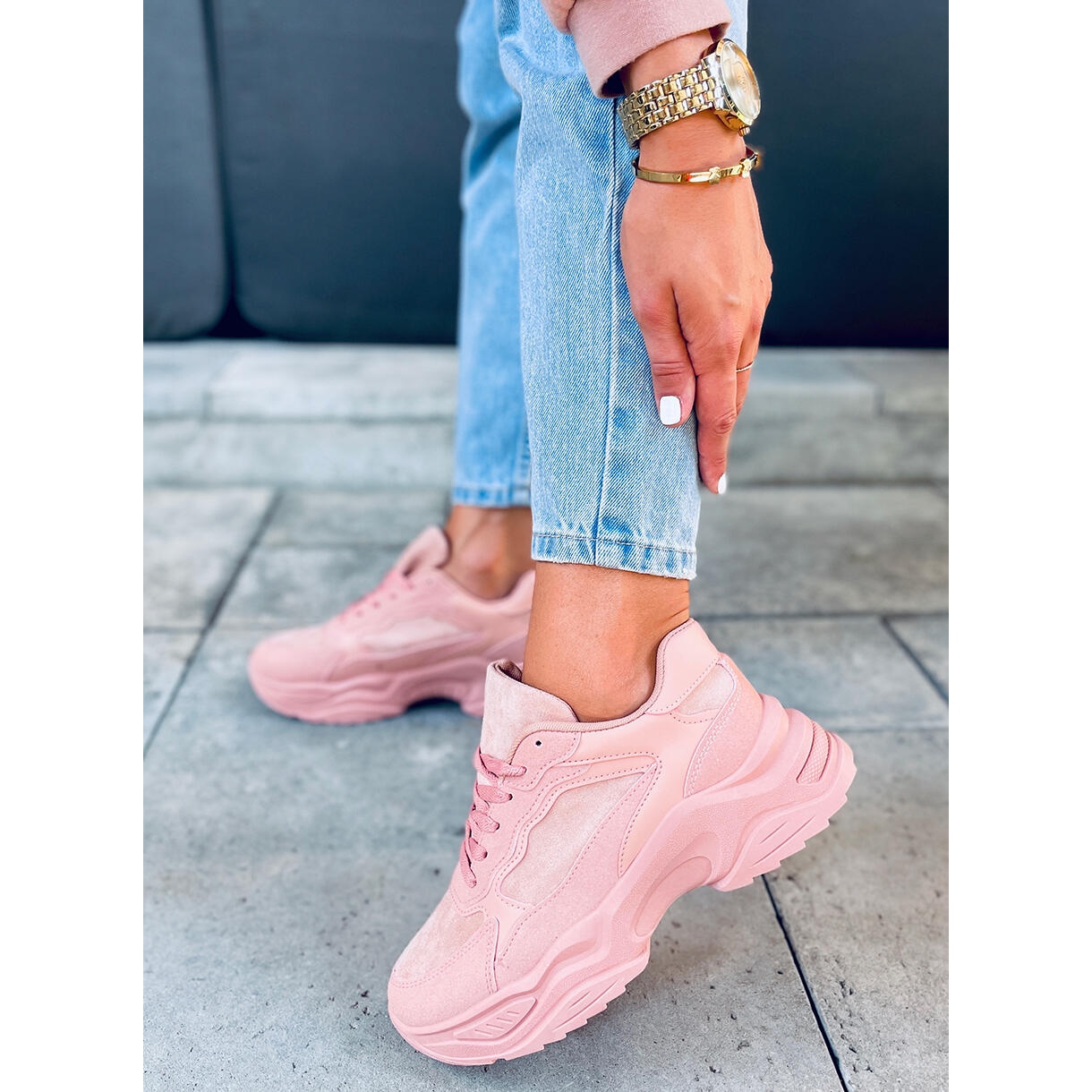 Os sapatos Dalla Pink são caracterizados por uma sola grossa e moderna, que não só acrescenta um caráter esportivo, mas também proporciona amortecimento adequado durante as atividades cotidianas. O interior do calçado é forrado com um tecido agradável, o que o torna confortável mesmo quando usado por muito tempo. A biqueira redonda e o salto plano tornam-nos numa solução ideal para o uso diário e durante o treino.