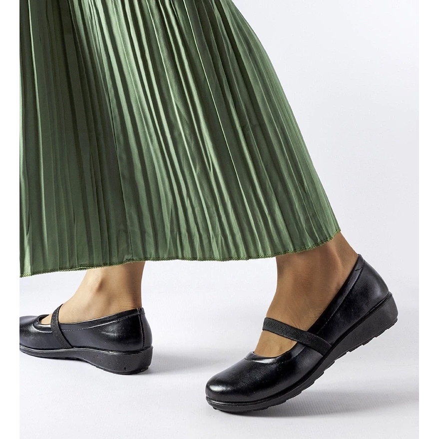 As bailarinas pretas para Oakland do fabricante D/GMR são uma excelente opção para os dias de verão, combinando elegância e conforto. Seu corte de deslizamento faz com que a colocação e a remoção de calçados seja rápida e sem problemas, o que é especialmente importante no meio dia quente. Graças ao salto baixo, as bailarinas garantem o conforto do uso, mesmo durante longas caminhadas.