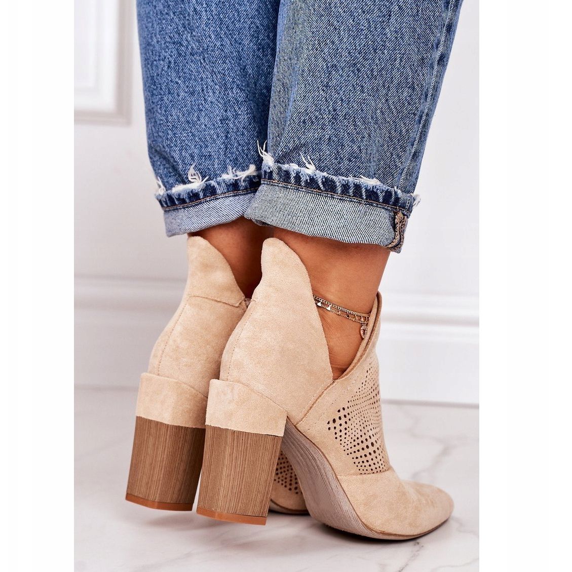 Estas são as botas perfeitas para a primavera - os botins bege com orifícios da Michelle. Feitos em camurça ecológica, esses sapatos estilosos combinam elegância com conforto de uso. A palmilha macia garante conforto de uso o dia todo, e o bastão estável de 9 cm de altura acrescenta um charme extraordinário a qualquer estilo.