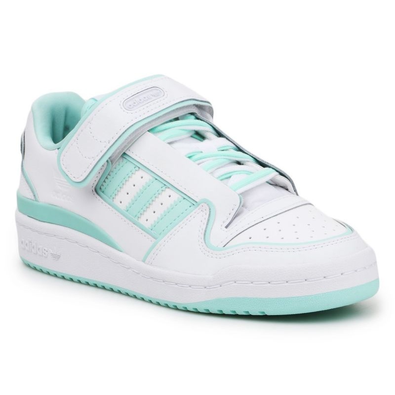 Os tênis clássicos do Fórum da Adidas na edição feminina combinam um personagem minimalista com um sotaque sutil e fresco. Uma parte superior branca e branca, de couro natural e inserções verdes claras, oferece aos sapatos uma aparência elegante e levemente retrô, e a sola com um piso sólido garante durabilidade e adesão no uso diário.