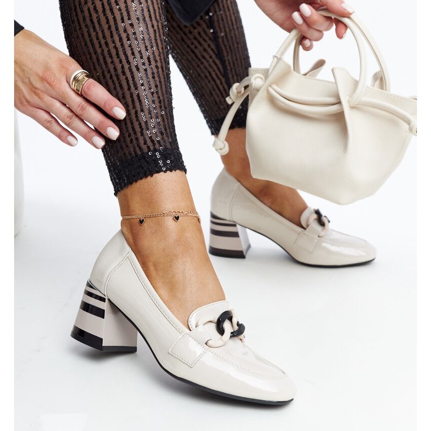 Detalhes: Sapatos bege de couro envernizado da Vinceza
