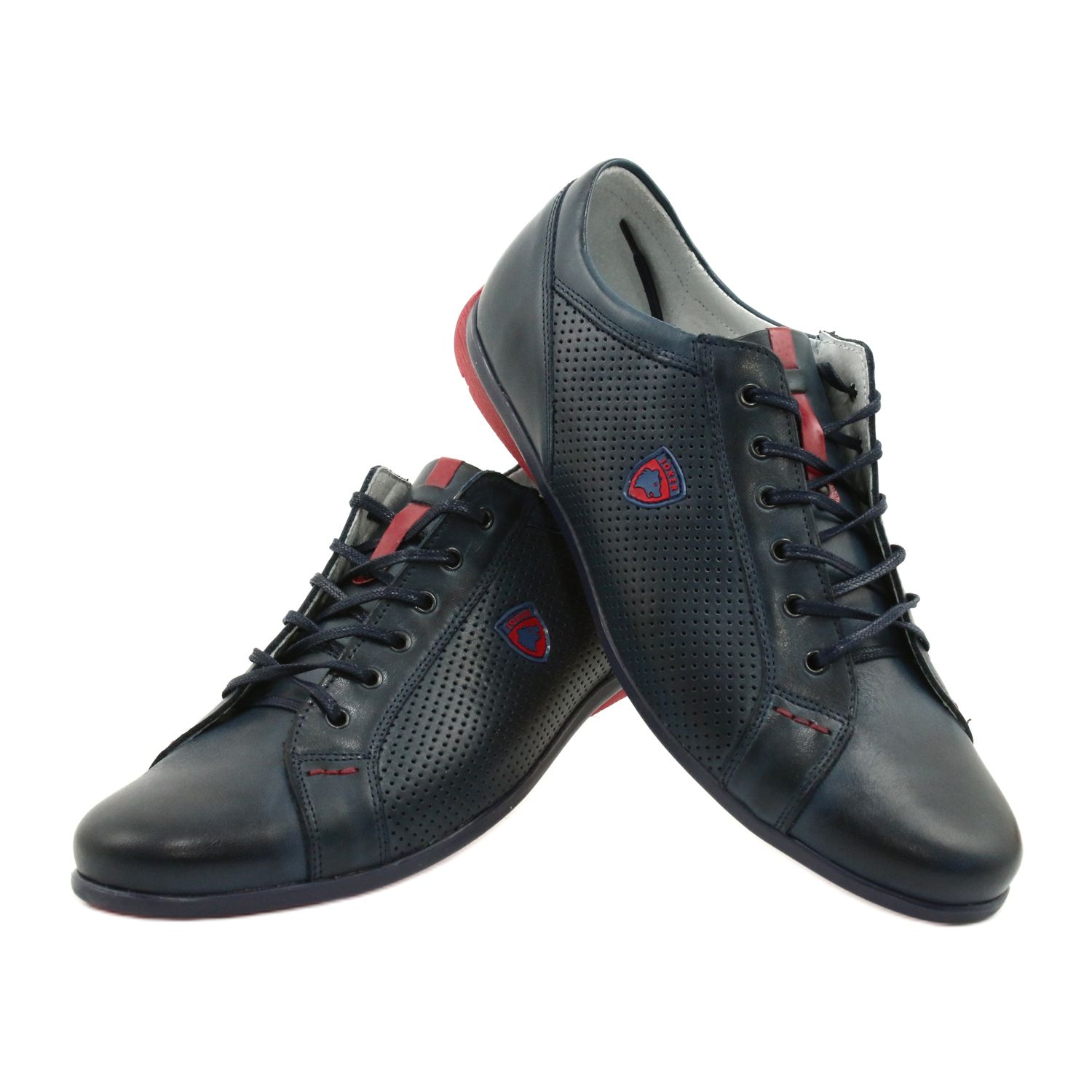 Os calçados casuais masculinos Joker 295 em azul marinho com detalhes em vermelho são a escolha perfeita para homens que valorizam conforto e estilo no dia a dia. Confeccionados em couro natural de alta qualidade, esses sapatos se diferenciam pelo cabedal liso, sutilmente realçado apenas pelos cadarços e furos em relevo nas laterais.