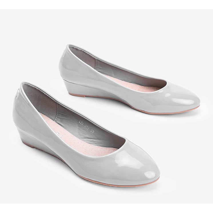 Descubra elegância e conforto num dos mais recentes modelos de scarpins - Chantal. Estes sapatos cinza de cunha baixa são a escolha perfeita para mulheres que desejam combinar estilo com funcionalidade. Confeccionados em couro ecológico envernizado de alta qualidade, têm um aspecto de extremo bom gosto e certamente se tornarão um elemento preferido do seu guarda-roupa.