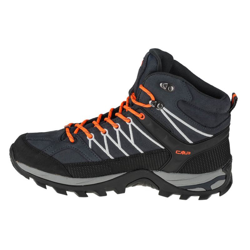 CMP RIGEL MID 3T12947-56UE SONOS SOLADOS SONOS MENINOS MENINOS EM TREKKING em cores pretas universais. O High Cut garante a estabilização do tornozelo durante a caminhada de montanha, e o laço clássico permite algum ajuste no pé.