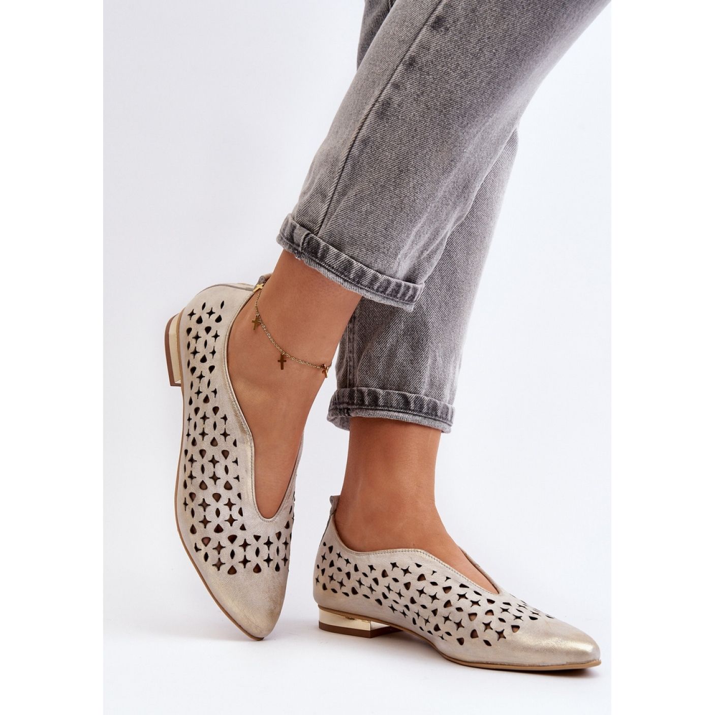 Descubra a elegância e a conveniência com o OpenWork Ballerinas Model Zazoo Gold! Essas bailarinas femininas exclusivas, feitas de couro natural da mais alta qualidade, combinam estilo clássico e design moderno. Seu nariz de amêndoa opticamente magro as pernas, e a parte superior do céu aberto lhes dá leveza e frescura, perfeitamente adequadas nas tendências da primavera-verão.