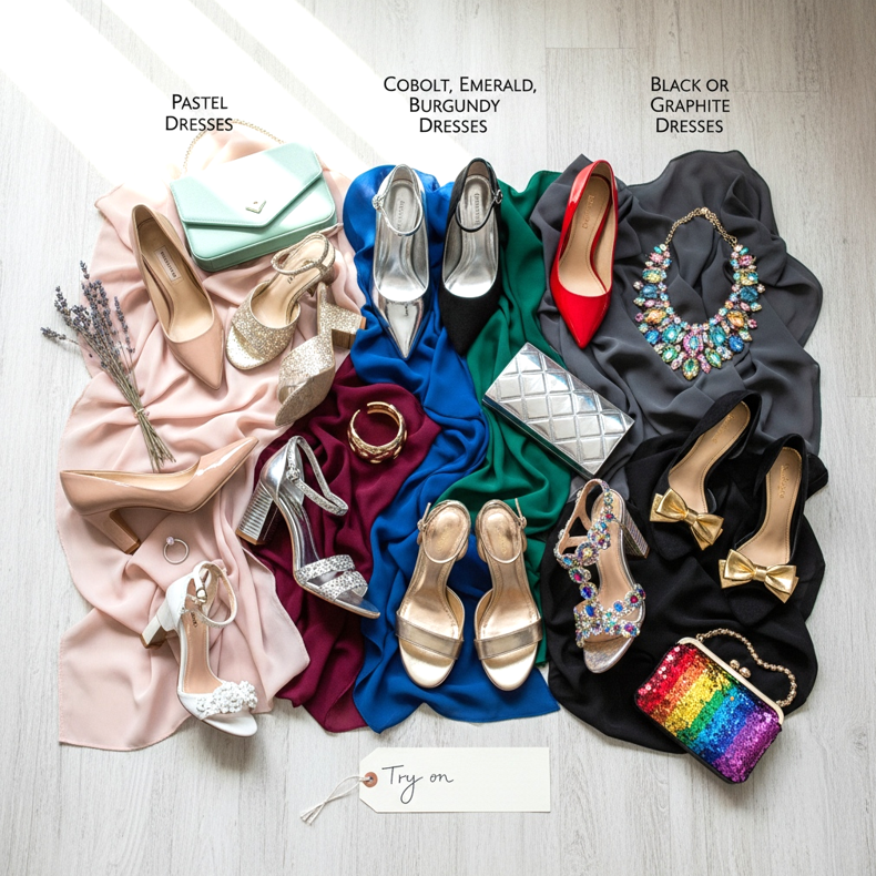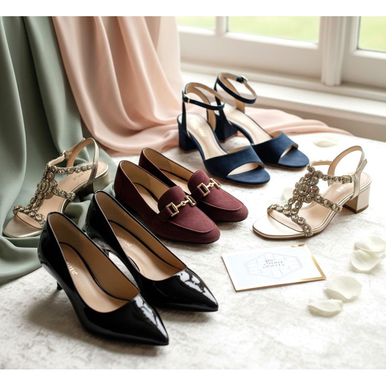 Para um casamento formal em um restaurante ou salão de casamento: salto alto elegante, sandálias de salto alto ou salto gatinho preto - esta é uma escolha segura e elegante. Evite sapatos e tênis excessivamente casuais, que podem parecer inadequados em um ambiente formal.