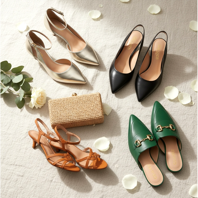 Para um casamento ao ar livre e menos formal: salto gatinho, mocassins, mules elegantes ou até sandálias rasteiras estilosas podem ser uma ótima escolha. Se o casamento for ao ar livre ou em uma fazenda, tome cuidado com sapatos de salto fino – eles podem grudar na grama e incomodar.