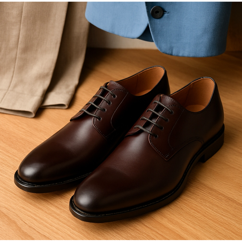 Os sapatos Derby são sapatos abertos, um pouco menos formais que os oxfords, mas ainda assim totalmente apropriados para um casamento. São especialmente adequados para casamentos rústicos, festas no jardim ou celebrações de verão. Um derby liso em marrom escuro ou bordô é uma excelente opção para ternos bege, verde-oliva ou azul. O derby liso (sem brocado) é mais formal que os modelos com decoração. Esta é uma ótima opção para hóspedes que valorizam o conforto - os sapatos derby costumam ser mais confortáveis quando usados por longos períodos de tempo.