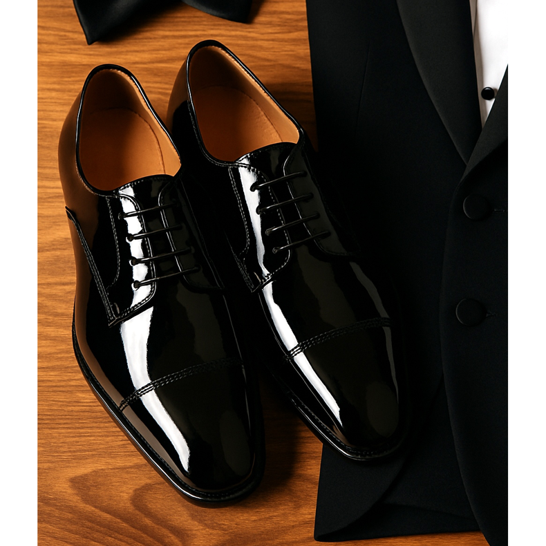 Sapatos masculinos envernizados (couro envernizado) são uma opção reservada para códigos de vestimenta de gravata branca ou gravata preta. Sapatos pretos de verniz só combinam com smoking ou fraque. Não os usamos com um fato normal ou para um casamento típico com código de vestimenta semi-formal ou cocktail. Se o convite de casamento especificar claramente um caráter muito formal (gala, black tie) - sapatos de couro envernizado serão apropriados. Caso contrário, escolha oxfords clássicos foscos que são mais versáteis e elegantes sem serem exagerados.