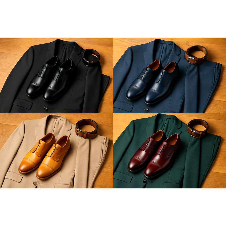 Regra básica: sapatos pretos combinam com ternos pretos, azul marinho, carvão e cinza escuro. Sapatos marrons (do marrom claro ao conhaque até o marrom escuro) combinam bem com ternos bege, cinza claro, azul e verde. Nunca combine sapatos pretos com faixa marrom ou sapatos marrons com faixa preta - o cinto e os sapatos devem ser da mesma cor. Os sapatos bordô (sangue de boi, bordô) são uma alternativa universal - combinam tanto com ternos escuros quanto claros. Evite sapatos marrons claros para casamentos muito formais.