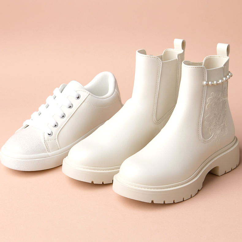 As tendências para 2025/2026 introduzem abordagens cada vez mais modernas ao calçado de comunhão. O tênis branco é uma nova alternativa às tradicionais sapatilhas, principalmente se a menina tem um vestido de comunhão mais informal ou se a família prefere um estilo mais descontraído. Os tênis são extremamente confortáveis e oferecem suporte perfeito para os pés do seu filho o dia todo. Eles podem ser decorados com elementos brilhantes ou enfeites sutis para combinar com a elegância da ocasião. Botins com elástico ou plataforma são outra opção que vem ganhando popularidade. Podem ser confeccionados em couro ecológico e possuem acréscimos delicados, como rendas ou pérolas, que vão dar charme a eles sem sobrecarregar a criança.