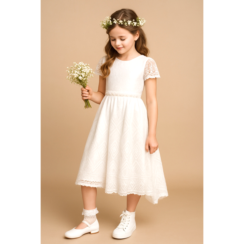 Na hora de escolher os sapatos de comunhão, não se esqueça do resto do estilo. As sapatilhas brancas combinam perfeitamente com um tradicional vestido de comunhão branco com acessórios de renda e cinto decorativo. Se você optar pelo tênis, ele pode ficar ótimo com um vestido de comunhão estilo boho mais moderno ou com estampas geométricas. Os botins podem combinar com vestidos com decoração mais definida ou com franjas. Não se esqueça das meias também - as meias brancas continuam sendo uma escolha clássica, mas você pode experimentar pequenos padrões ou meias de renda se combinarem com o resto da sua roupa. Não se esqueça de todo o styling - joias, penteado e um pequeno buquê de flores são os elementos que complementam o look elegante. Os sapatos devem apenas complementar todo o look, não seu personagem principal.