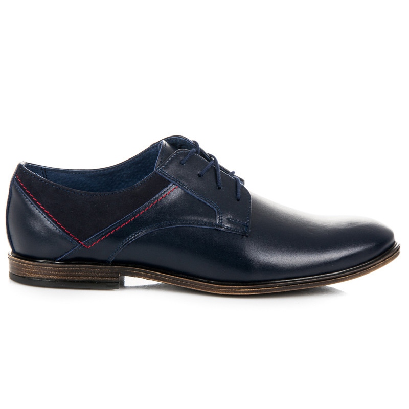 Sapatos elegantes e requintados para um homem que aprecia clássicos com um toque distinto. A parte superior é confeccionada em couro natural de alta qualidade - durável, resistente e fácil de cuidar. A costura vermelha contrastante adiciona personalidade, animando sutilmente o tom azul suave dos sapatos. O modelo com cadarço, bico redondo e salto reforçado embutido, garante conforto e estabilidade no uso.