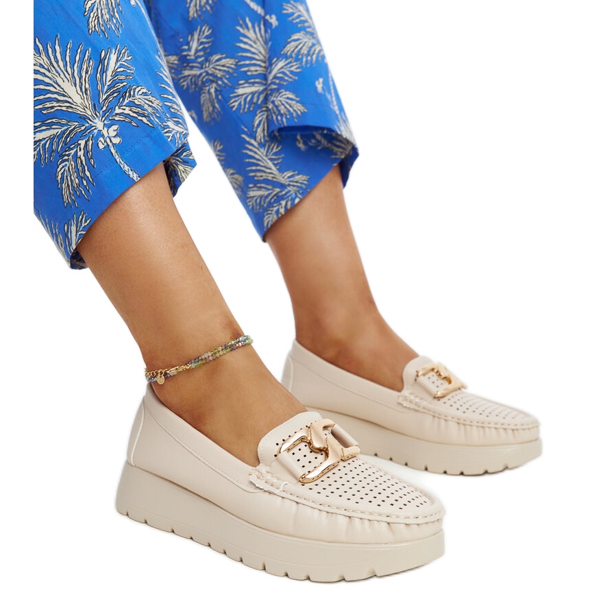 Os sapatos de couro bege com fivela decorativa são um modelo versátil que você pode compor facilmente com várias estilizações - de casual a um pouco mais elegante. Invista neste complemento elegante e aproveite o conforto e o estilo todos os dias! Na caixa original do fabricante, esses sapatos também são uma ótima ideia de presente.