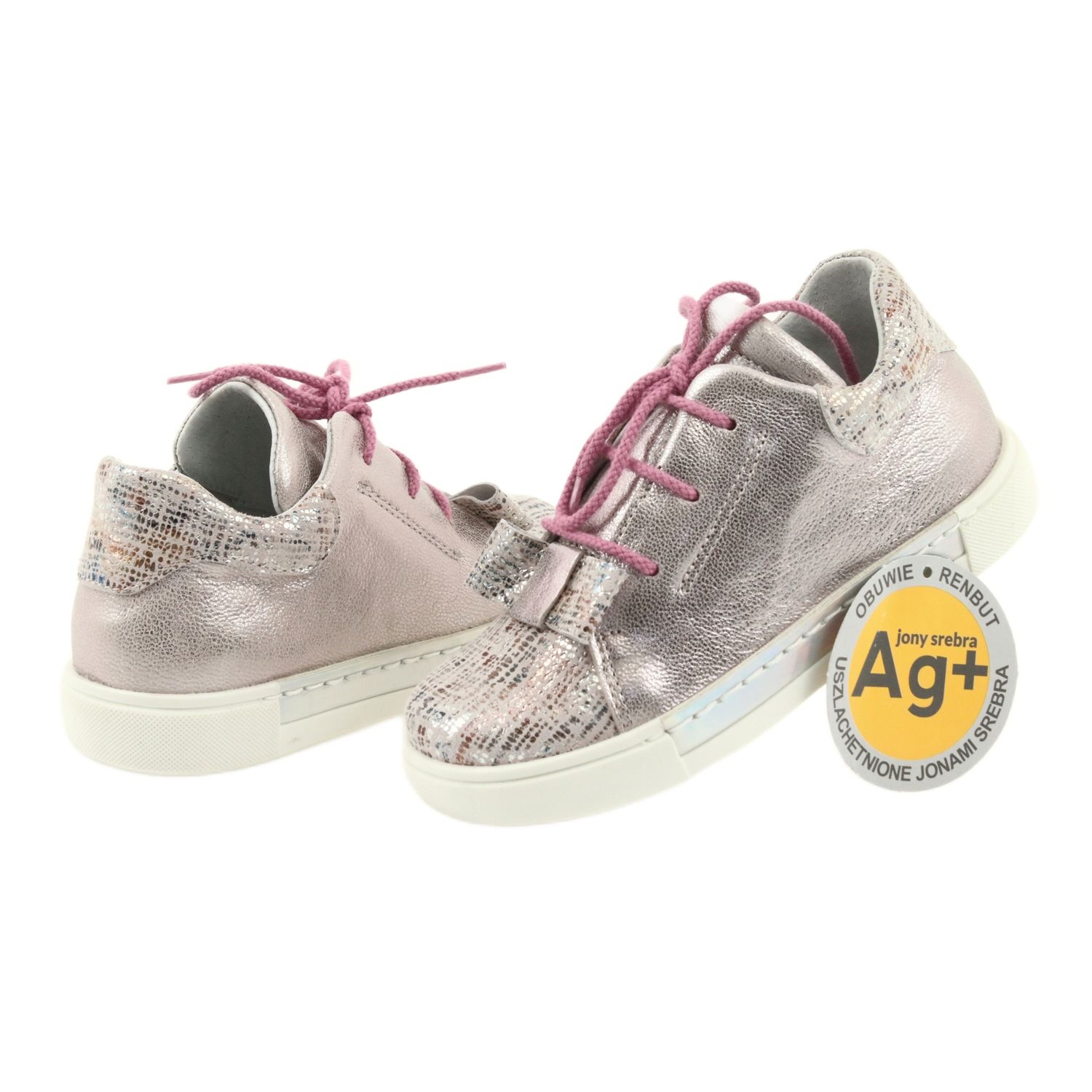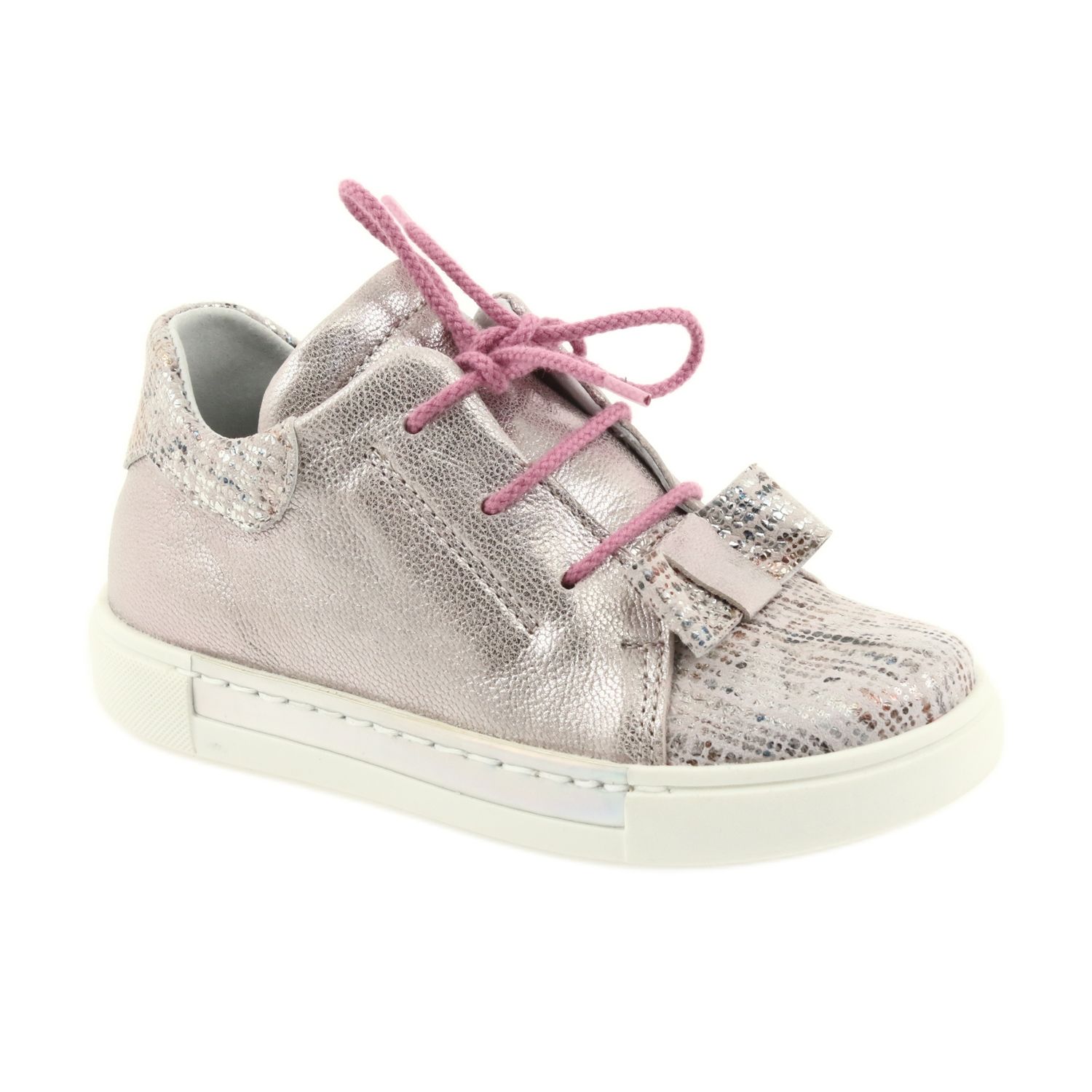 Delicado e ao mesmo tempo confortável - Reno, mas os sapatos 3303 são uma oferta para garotas ativas que gostam de um estilo esportivo com sotaque feminino. Feito de couro natural em tons de pó de pó de pérola rosa, com um laço prateado como uma decoração sutil.
