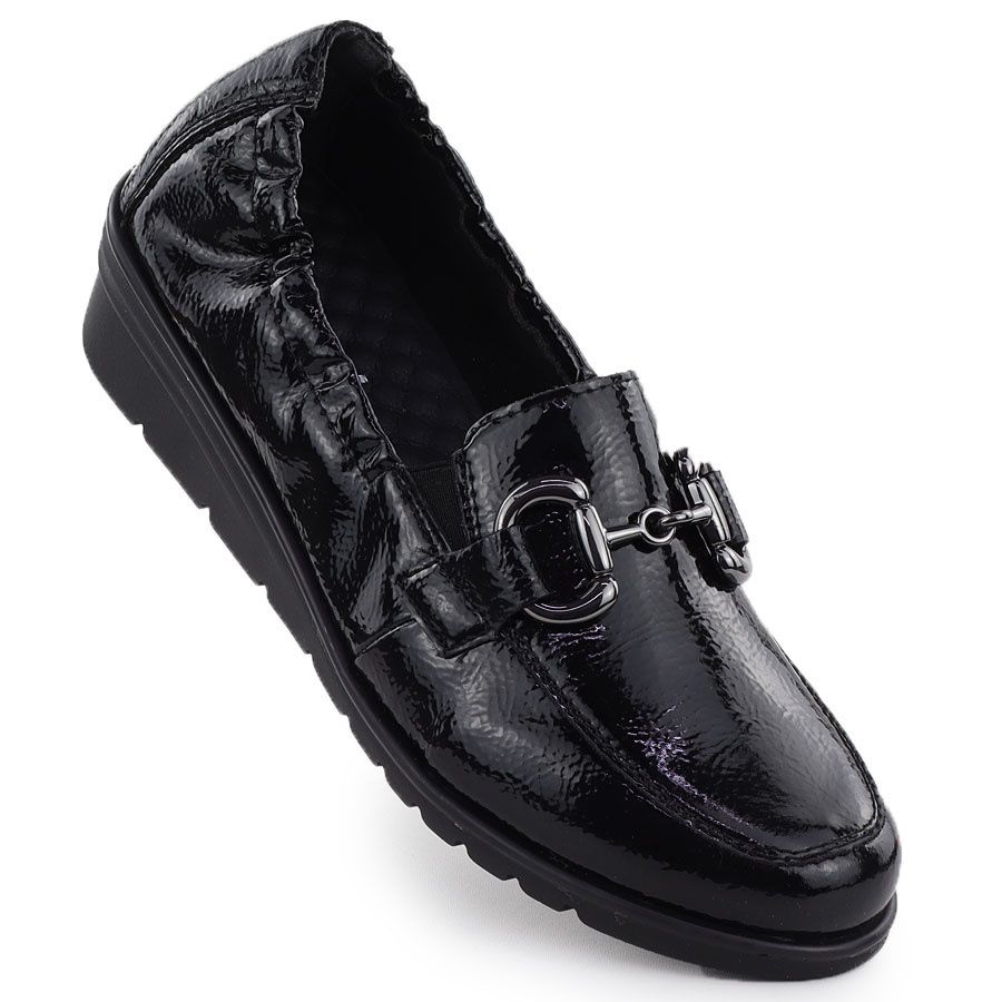 Detalhes: Sapatos de couro feminino lacados nas cunhas preto rieker l5352-00