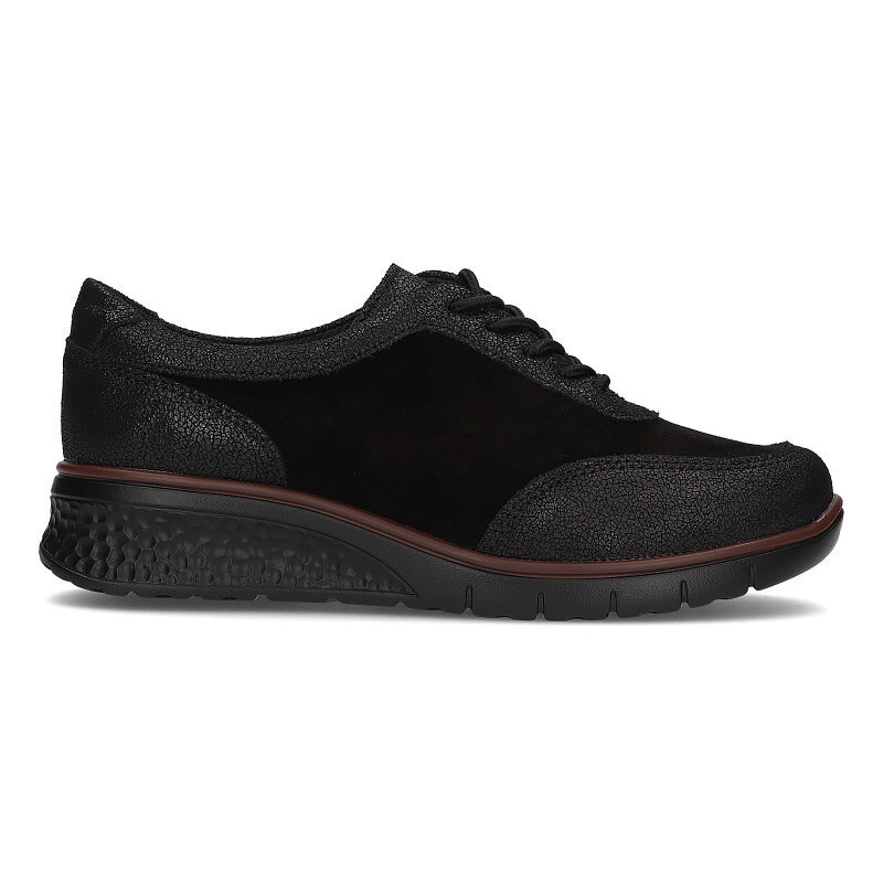 Este modelo pertence à linha KeeShoes, o que comprova o seu design moderno. Os sapatos têm cano de 6,5 cm de altura e plataforma de 1 cm de altura, o que os torna práticos e estilosos. Além disso, o conforto no uso é garantido pelo material sintético da sola, e a palmilha em couro ecológico garante ventilação adequada.