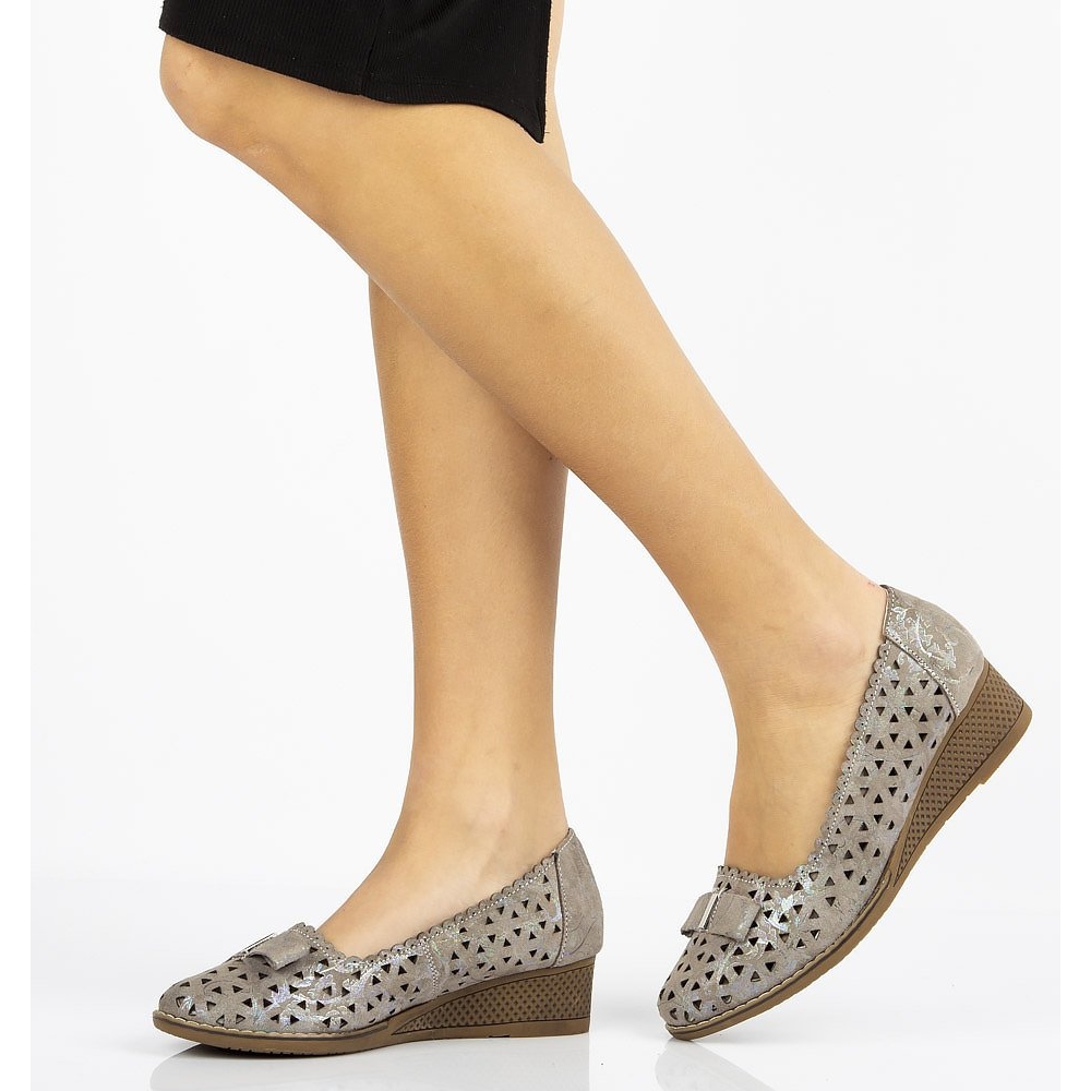 O modelo DP752/20 apresenta design slip-on que facilita a colocação e a retirada do calçado. A biqueira redonda e a cunha de 4,5 cm de altura fazem com que o calçado combine com vários conjuntos - tanto com calças como com vestidos. Além disso, a sola castanha contrasta perfeitamente com a cor cinzenta, conferindo ao conjunto um aspecto clássico.