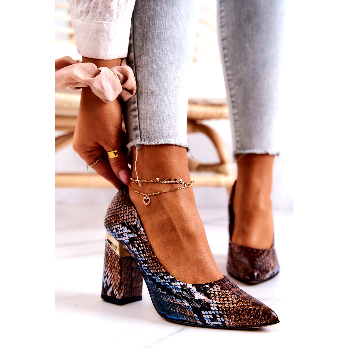 A característica biqueira amendoada e o elemento decorativo no salto conferem ao calçado um carácter original, chamando a atenção. O salto de 9 cm em forma de bloco garante estabilidade e conforto, e o padrão animal da moda está sempre na moda.