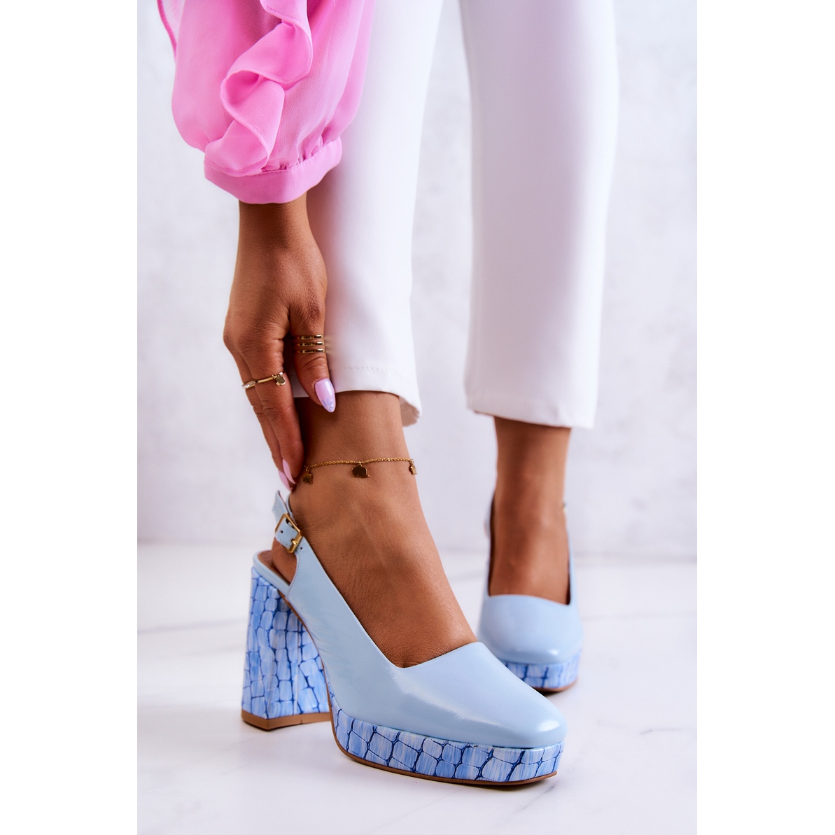 Estes scarpins distinguem-se pelo salto aberto e uma tira ajustável presa por fivela, o que garante não só a estética, mas também um ajuste perfeito ao pé. A biqueira do sapato é forrada, o que lhe confere um visual elegante, e o enorme salto (altura 10 cm) oferece estabilidade, para que você ganhe confiança a cada passo.