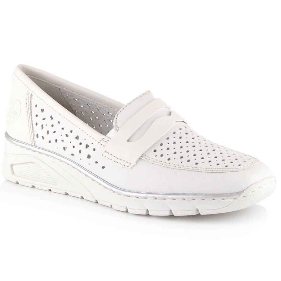 Detalhes: Sapatos de cunha em pele de mulher Rieker N3356-80 branco