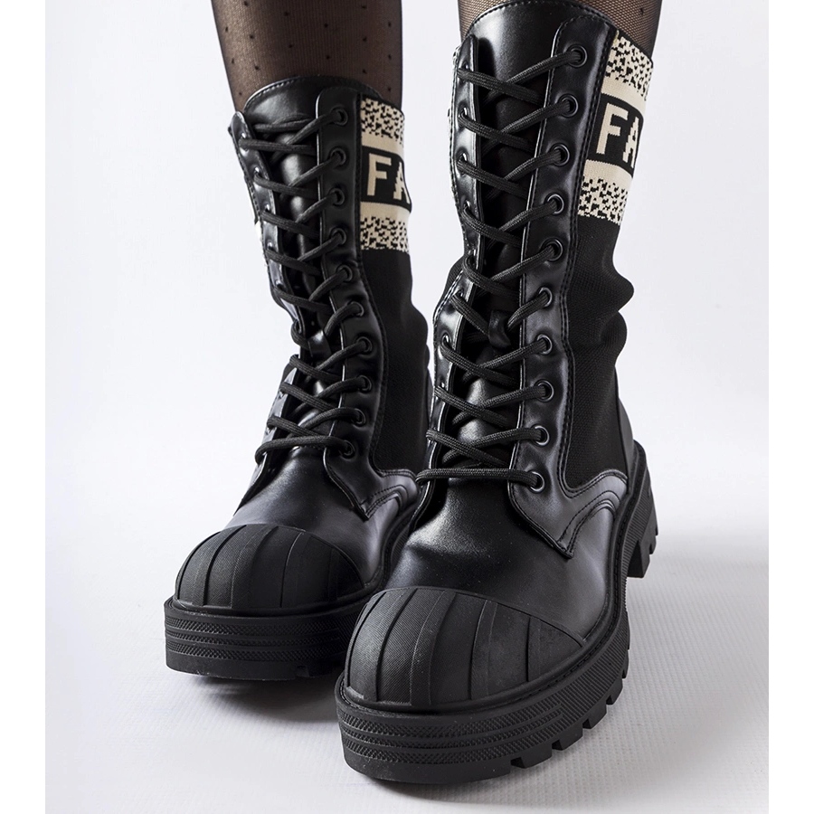 As meias femininas elegantes e minimalistas com uma inscrição branca "Daria". O modelo com uma altura (28 cm) combina um corte moderno e adjacente com o conforto de um salto plano (4,5 cm). A parte externa é feita de couro ecológico, uma sola de borracha preta e uma inserção de tecido garantem o conforto do desgaste durante toda a temporada, do outono à primavera. O fecho nos cadarços e o nariz redondo complementam a forma clássica e universal.