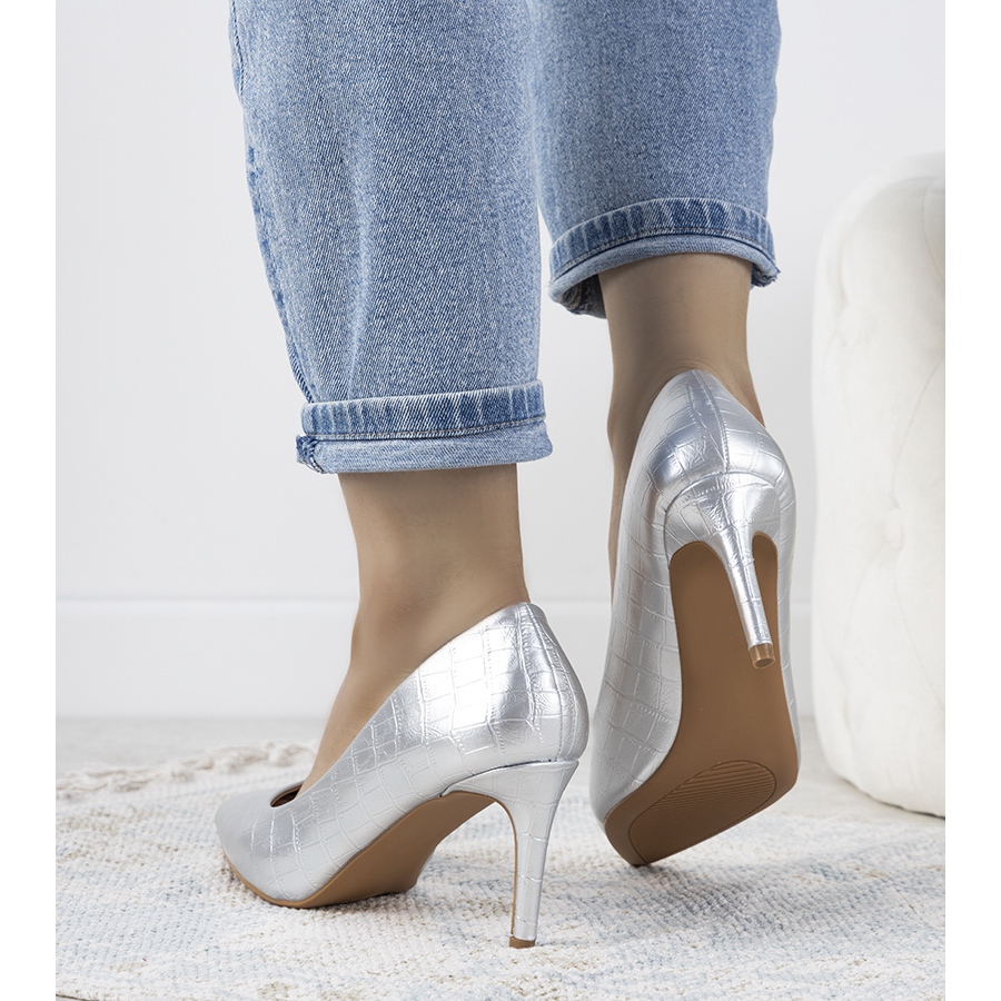Os sapatos prateados de salto alto da Byatt são uma escolha única para mulheres elegantes que desejam adicionar um pouco de brilho ao seu estilo. Perfeitos para casamentos, festas ou trabalho, estes sapatos deliciam-se com o seu corte moderno e a estrutura da pele de crocodilo, o que lhes confere um carácter único.
