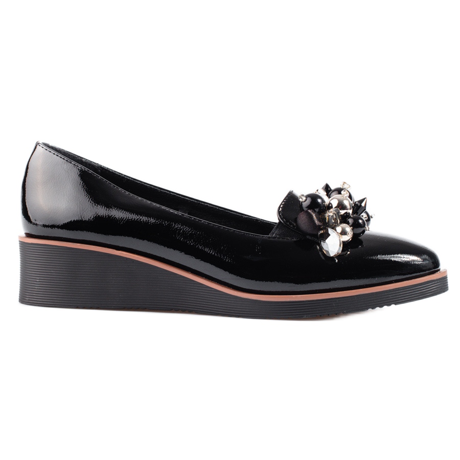 O material externo é confeccionado em couro ecológico envernizado de alta qualidade, e o interior dos escarpins é uma mistura de couro sintético e couro natural durável, o que garante ventilação adequada e uma experiência agradável durante o uso. Uma vantagem adicional são os strass sutis que conferem aos sapatos um caráter distinto, tornando cada estilo único e brilhante.