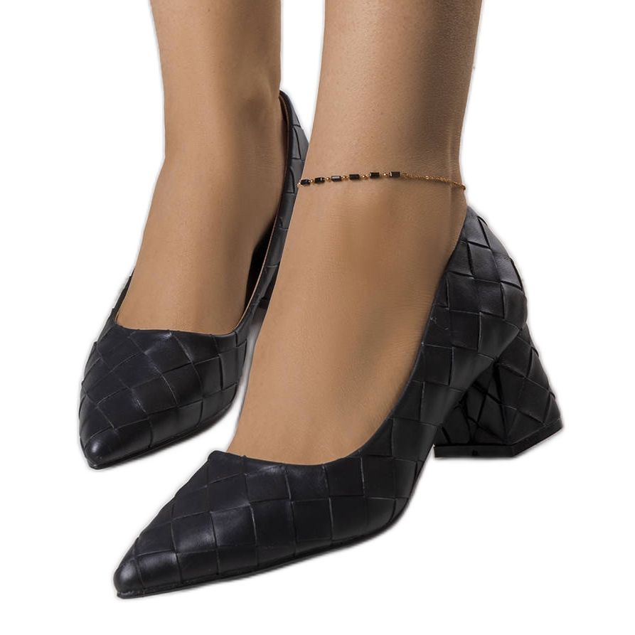 As bombas migne elegantes são uma proposta para mulheres que valorizam o estilo, o conforto e a versatilidade. Uma parte superior lisa e preta feita de couro ecológico e um sutil spitz dão a leveza da figura, e um salto estável, como um posto (3,5 cm), proporciona conforto ao longo do dia. Perfeito para o escritório, para reuniões e passeios noturnos - você pode combinar facilmente com o vestido e o cigarros.