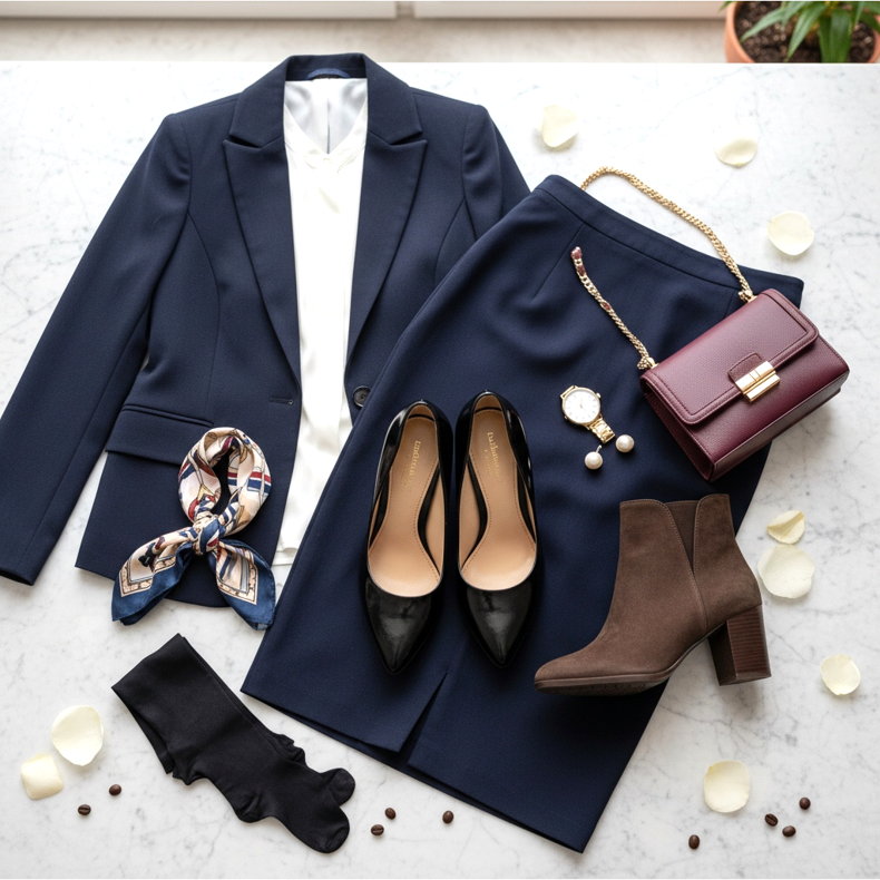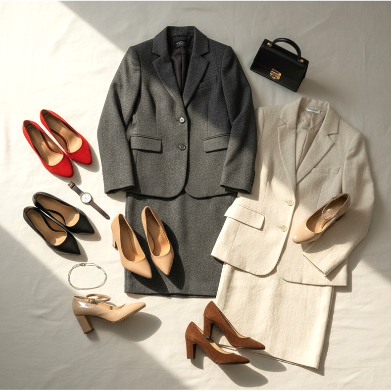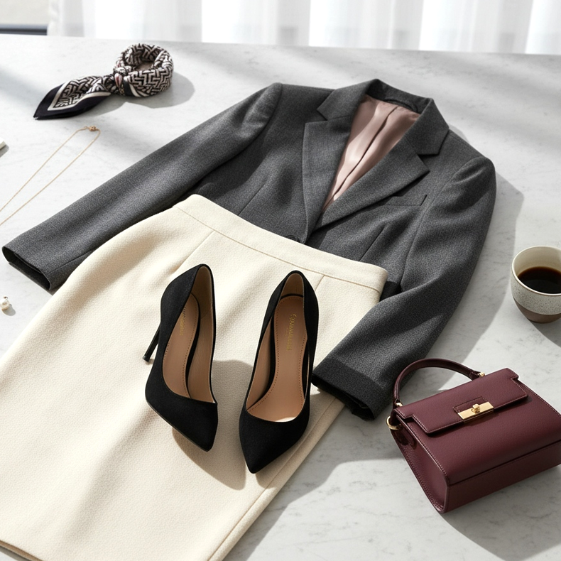 Um terno é uma ótima opção para o escritório, desde que você o estilize de maneira adequada. Sapatos elegantes de salto alto são os melhores para o trabalho, pois alongam opticamente as pernas e acrescentam graça à sua silhueta.