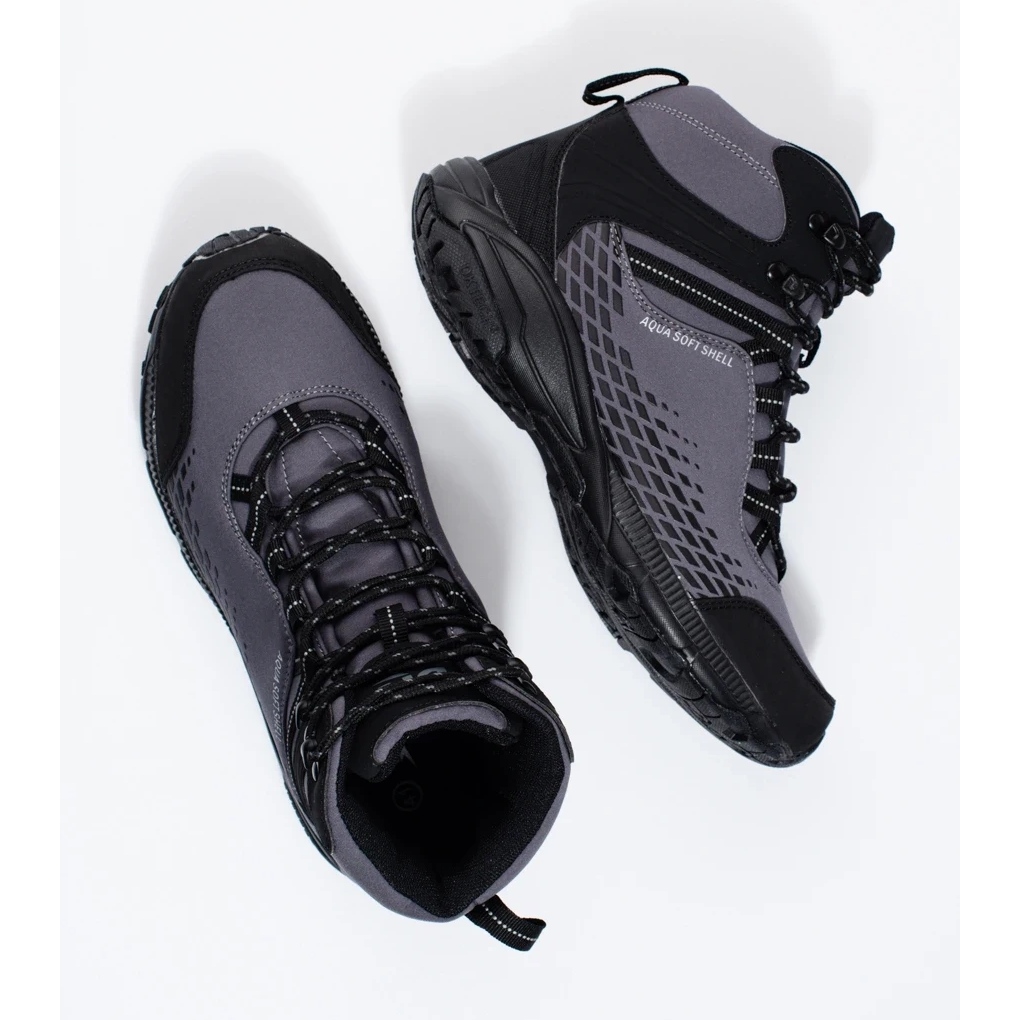 Sapatos modernos e funcionais de trekking em uma cor cinza neutra - perfeita para viagens de fim de semana, caminhadas mais longas e atividades ao ar livre. A combinação de couro ecológico com materiais têxteis e a camada de concha macia fornece proteção contra o vento, boa respirabilidade e aumento da resistência à umidade.