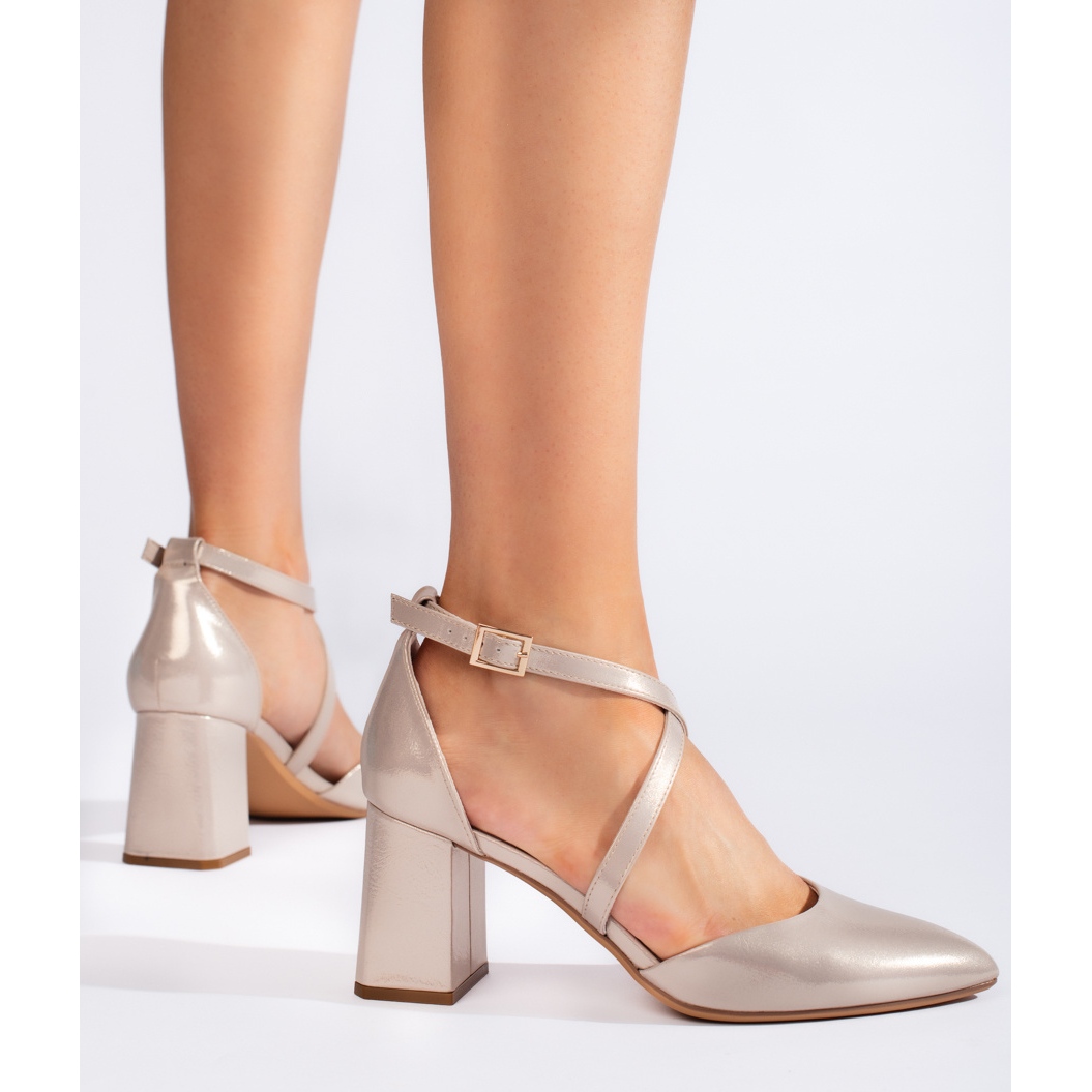 Feito de couro ecológico de camurça, as bombas são distinguidas por uma bela cor dourada que chama a atenção e dá brilho a todas as criações. Um nariz redondo e um fecho deslizante proporcionam não apenas uma aparência elegante, mas também conforto de desgaste. A inserção de couro cuida do conforto dos pés, mesmo durante longas horas de dança ou diversão.