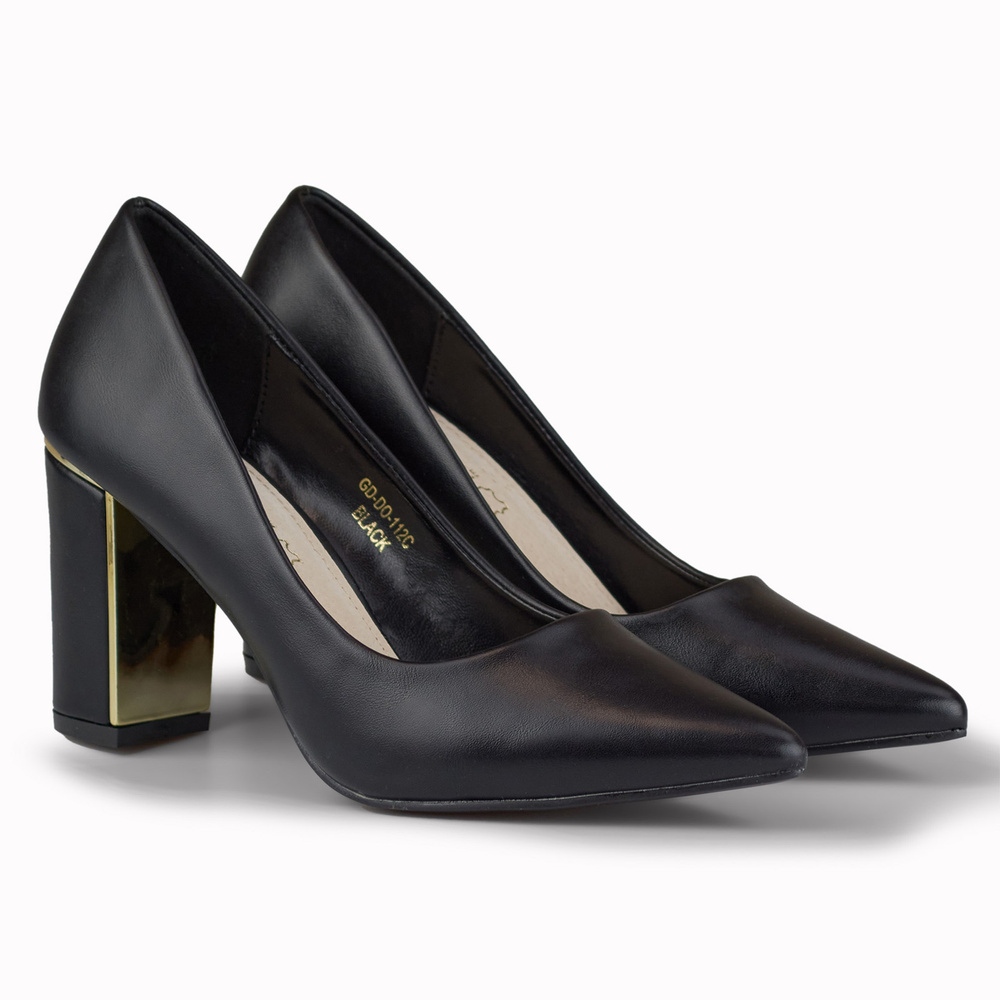 Detalhes: Sapatos elegantes com salto decorativo preto