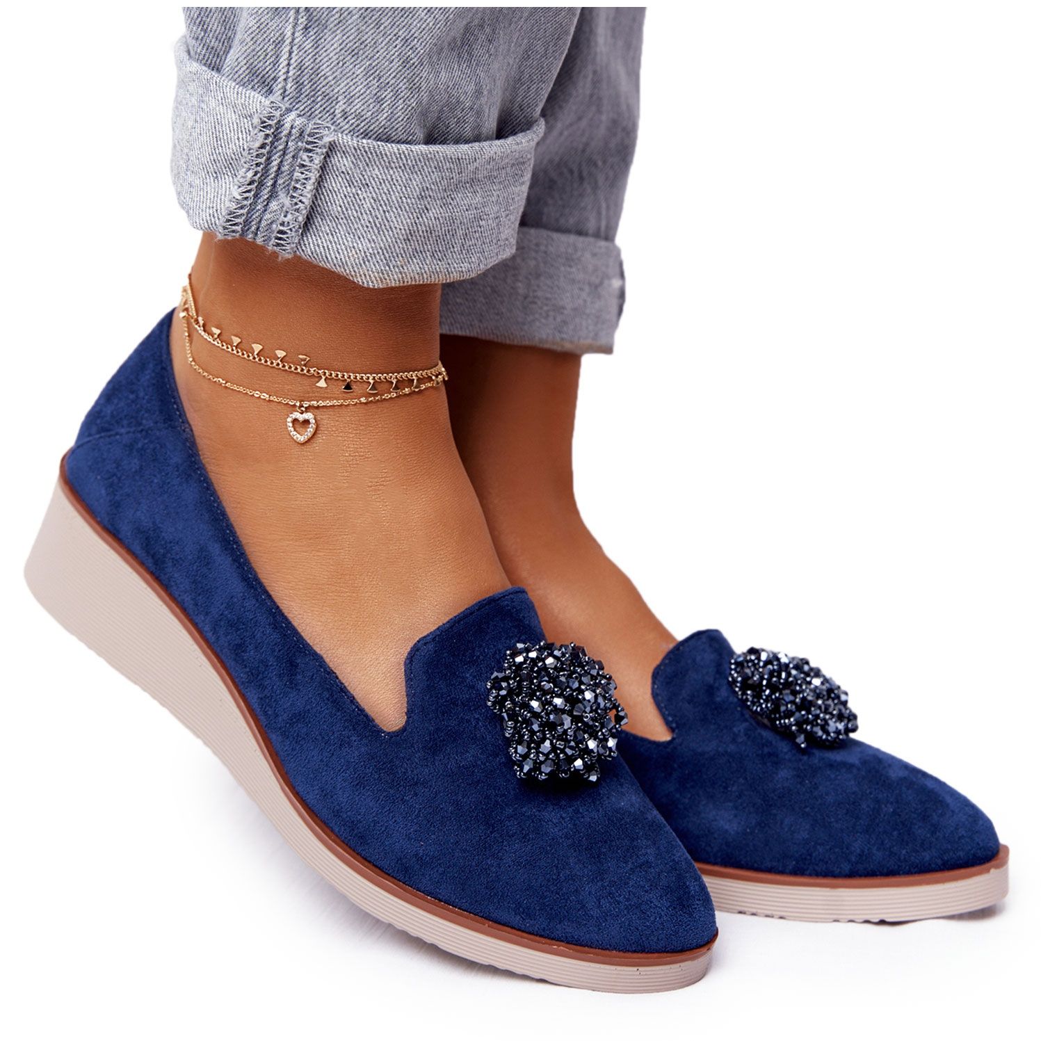 O interior dos sapatos é forrado com couro natural, o que os torna confortáveis para usar o dia todo. Graças ao design slip-on, calçar e tirar os sapatos é simples e prático. A biqueira redonda acrescenta classe e os strass delicados acrescentam um toque sutil de brilho que distingue esses sapatos de outros modelos.