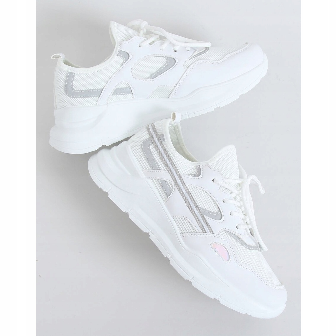 A cor branca universal torna estes sapatos intemporais e fáceis de combinar com vários estilos. Ao mesmo tempo, o design sem padrões enfatiza o caráter elegante e sutil dos sapatos, com um toque delicado na forma de elementos holográficos, tornando-os únicos.