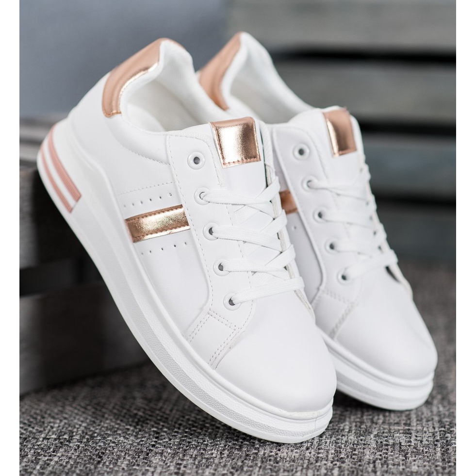 Descubra estilo e conforto únicos graças aos calçados esportivos SHELOVET brancos com detalhes dourados! Estes sapatos visíveis são a escolha perfeita tanto para o estilo casual do dia a dia quanto para roupas mais esportivas. Confeccionados em couro ecológico de alta qualidade, combinam elegância com funcionalidade, tornando-os um complemento versátil para qualquer guarda-roupa.