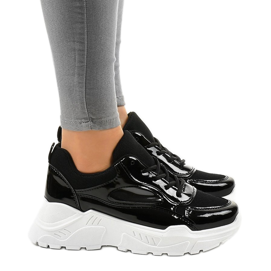 O calçado desportivo preto da moda MS381E é a escolha perfeita para mulheres que pretendem aliar conforto a um estilo único. Estes sapatos com atacadores e sola alta branca de 6 cm de altura certamente vão chamar a atenção. Fabricados em material semelhante ao couro de alta qualidade, caracterizam-se por um elegante acabamento lacado que lhes confere um aspecto moderno.