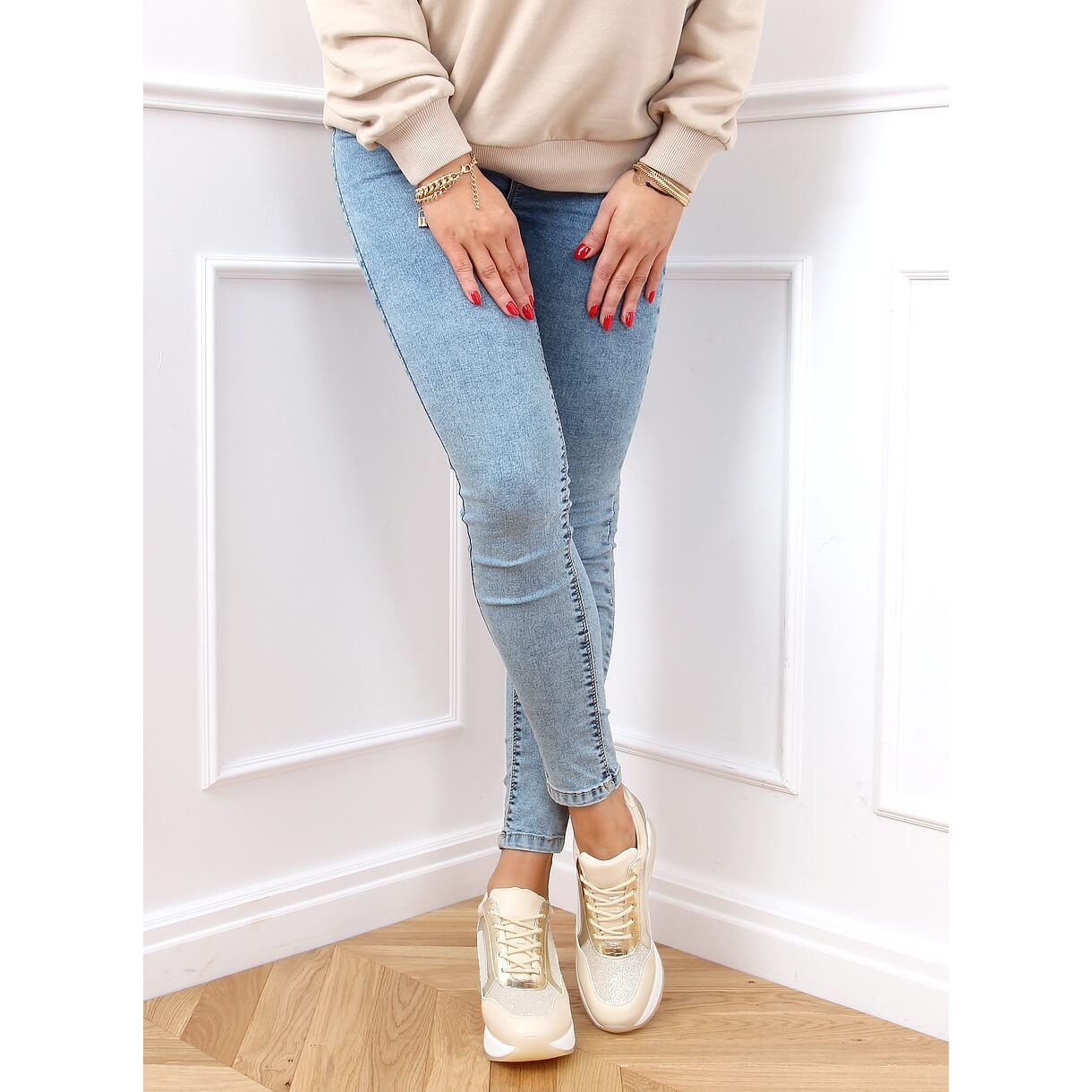 Detalhes: Sapatos esportivos em uma cunha oculta bege e dourado RQ288 bege