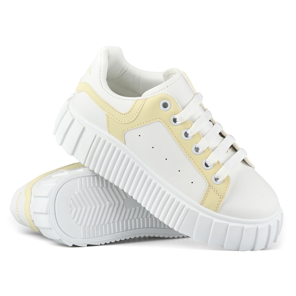 Clássico, versátil e moda - sapatos esportivos brancos na plataforma de outra marca são uma proposta para mulheres que valorizam o conforto e o estilo. Feito de couro ecológico, com laço e uma palmilha têxtil, eles são perfeitos na primavera/verão como base para as estilizações urbanas cotidianas.