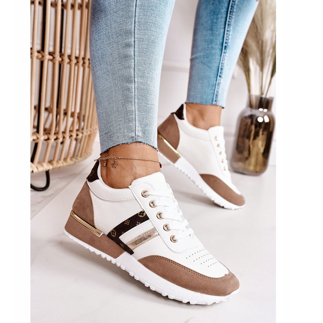 Detalhes: Sapatos esportivos femininos. Tênis branco-cáqui Estilo de vida