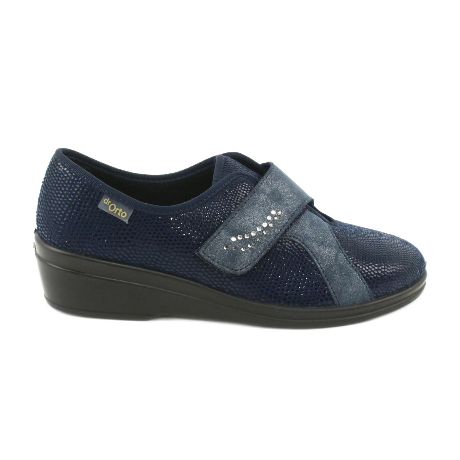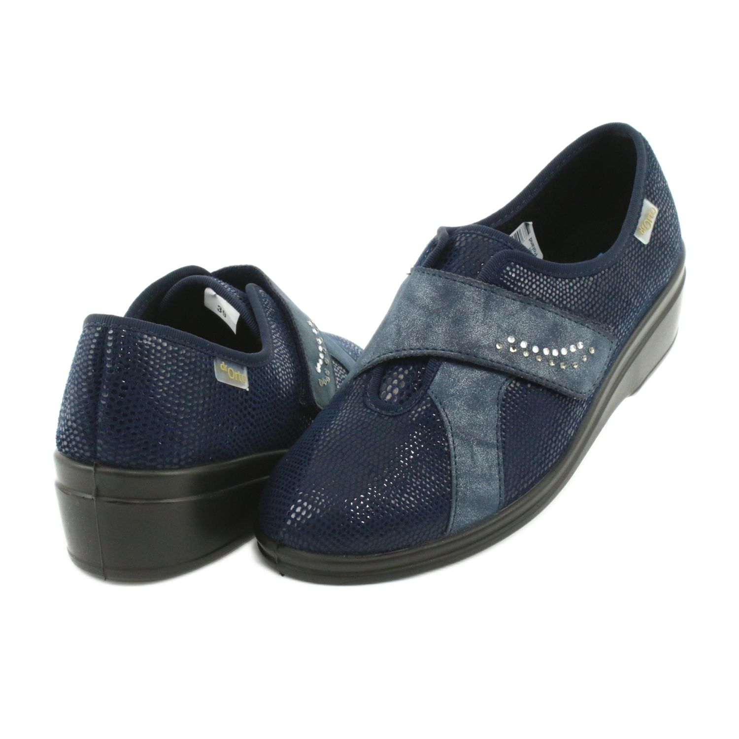 Uma vantagem adicional do modelo 032D001 são os zircões, que lhe conferem um caráter único. A cor azul marinho combina perfeitamente com vários estilos, e a sola preta confere um visual elegante. Com bico redondo e fecho de velcro, esses sapatos decotados não são apenas confortáveis, mas também fáceis de comprar e proporcionam um ajuste perfeito.