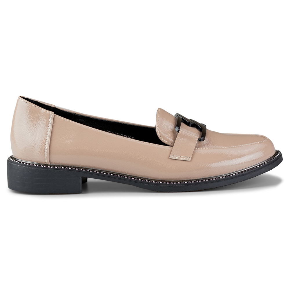 Sapatos de mocassim femininos elegantes e envernizados, combinando um corte clássico com um brilho moderno. Escorregou, em uma sola plana, com uma plataforma sutil de 2,5 cm, com nariz redondo e inserção de couro natural - ideal para estilos de escritório e urbanos.