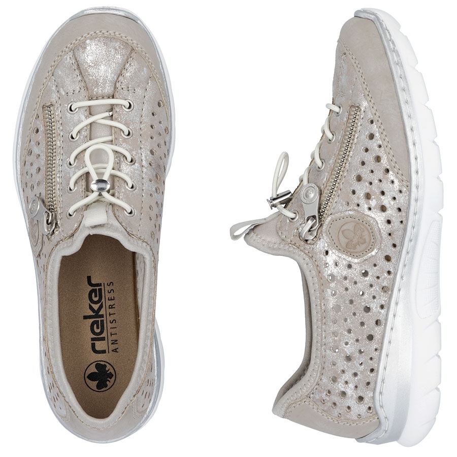 Sapatos femininos confortáveis Open Work BEIGE PRATA PRATA RIEKER L32P6-90 é a escolha perfeita para mulheres que valorizam a combinação de conveniência com as últimas tendências. Feito pela renomada marca alemã Rieker, esses sapatos leves e flexíveis foram projetados para proporcionar aos pés conforto e liberdade extraordinários.