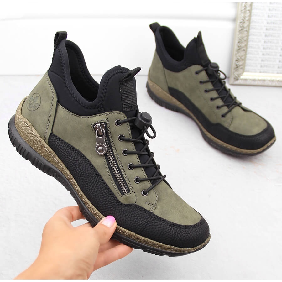 Detalhes: Sapatos femininos confortáveis, tênis verdes Rieker N32G3-54