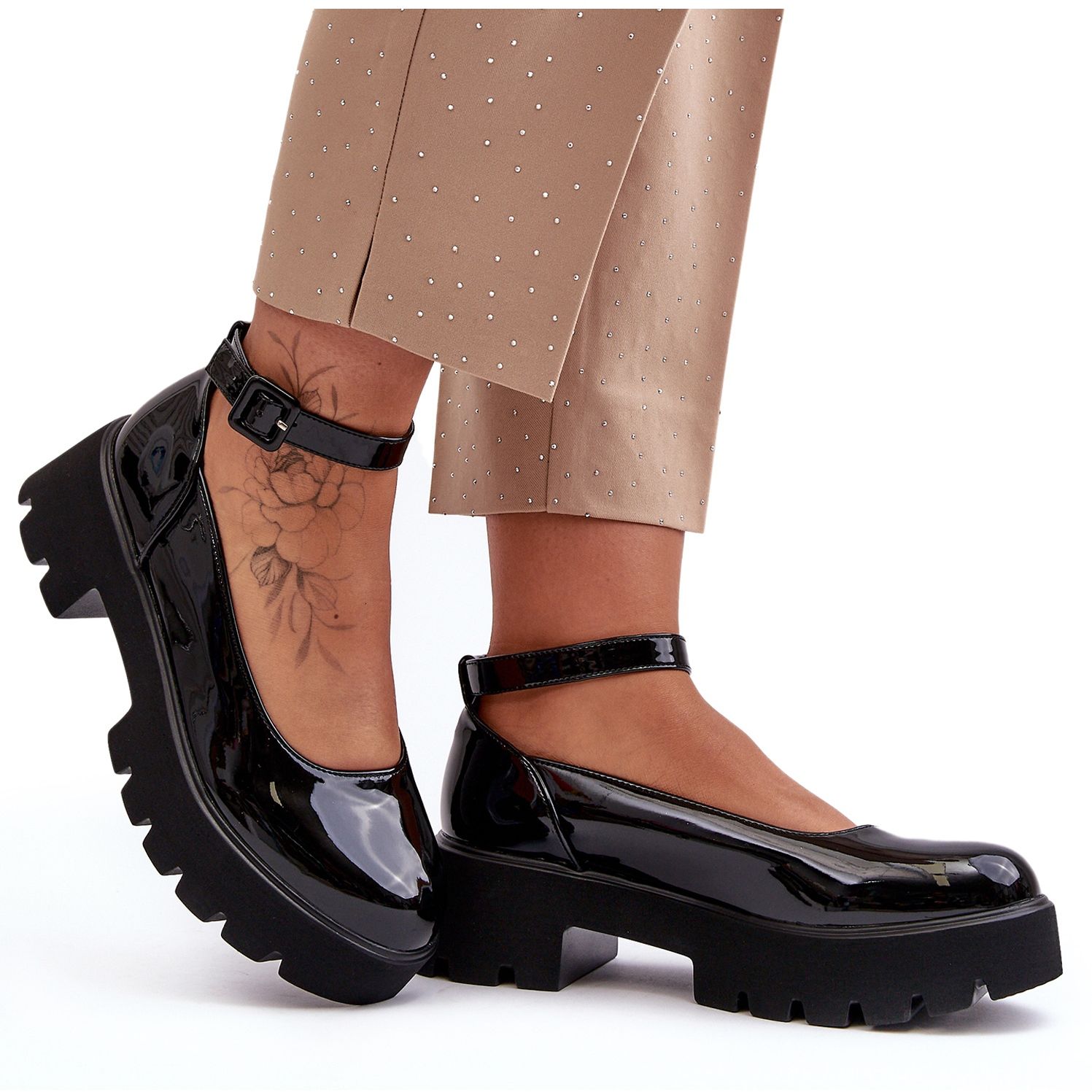 - Modelo: Sapatos de couro envernizado com salto baixo e fivela