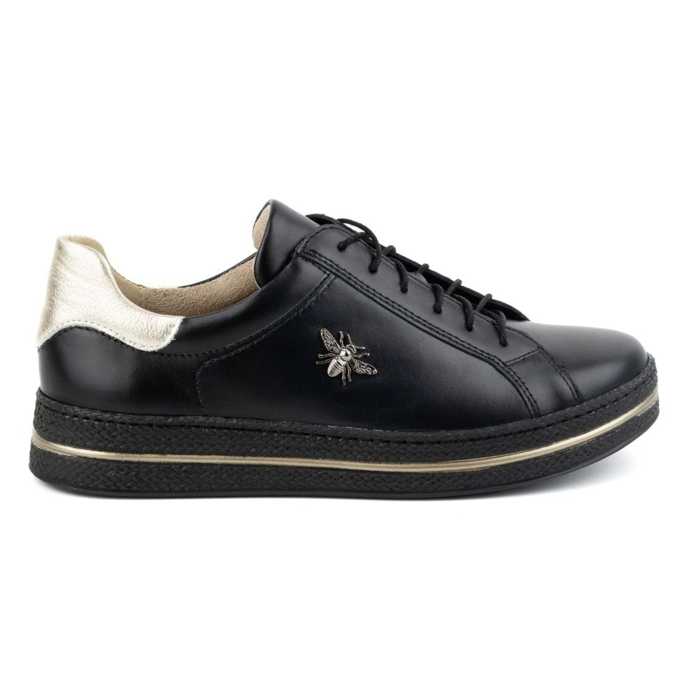 Sapatos femininos de Olivier estilo tênis de couro 1190 em preto é uma ótima opção para todas as mulheres modernas que querem combinar conforto com estilo elegante. Esses tênis exclusivos são distinguidos por um brilho sutil e delicado de um remendo de ouro na lateral e um salto dourado, o que lhes dá um personagem um tanto luxuoso.