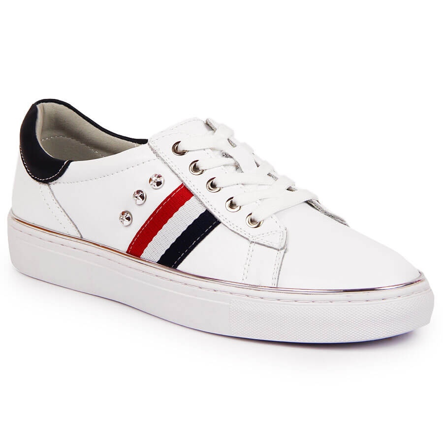 Detalhes: Sapatos femininos de couro, tênis branco Vinceza