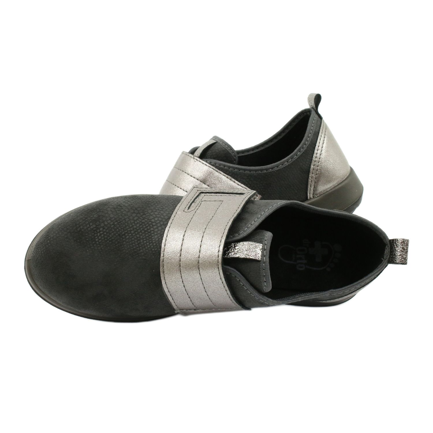 Dr.orto Befado 156D003 - Sapatos domésticos confortáveis para mulheres, combinando simplicidade e funcionalidade. Material têxtil preto com inserções cinza sutis e levemente brilhantes nas costas e na fixação lhes dão uma aparência elegante e prática. Um nariz redondo e clássico e uma inserção de material macio, garantam conforto o dia todo.