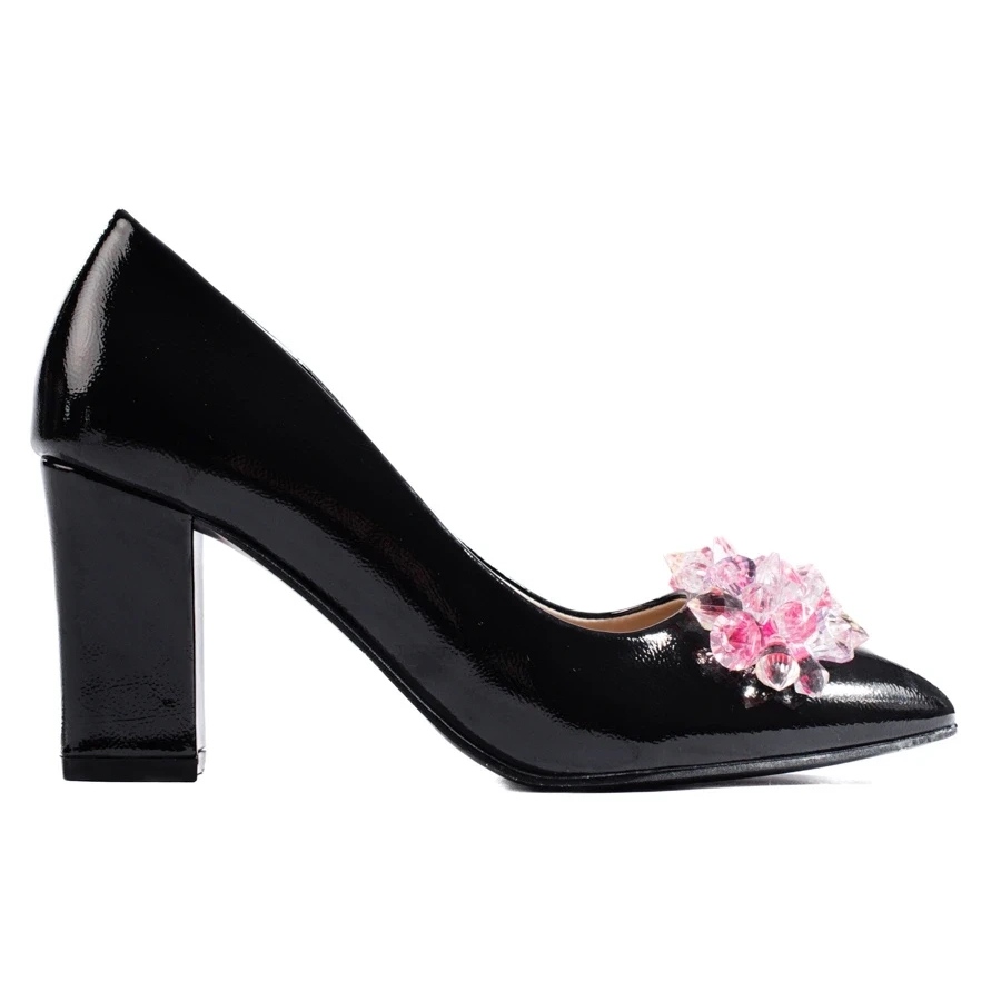 Bombas pretas clássicas no poste (salto de 8 cm) feitas de couro ecológico envernizado, decorado com strass. Modelo com o nariz redondo e um fixador e rígido construído, uma inserção de couro natural que garante o conforto. Perfeito para celebrações, passeios noturnos e elegantes estilos casuais.