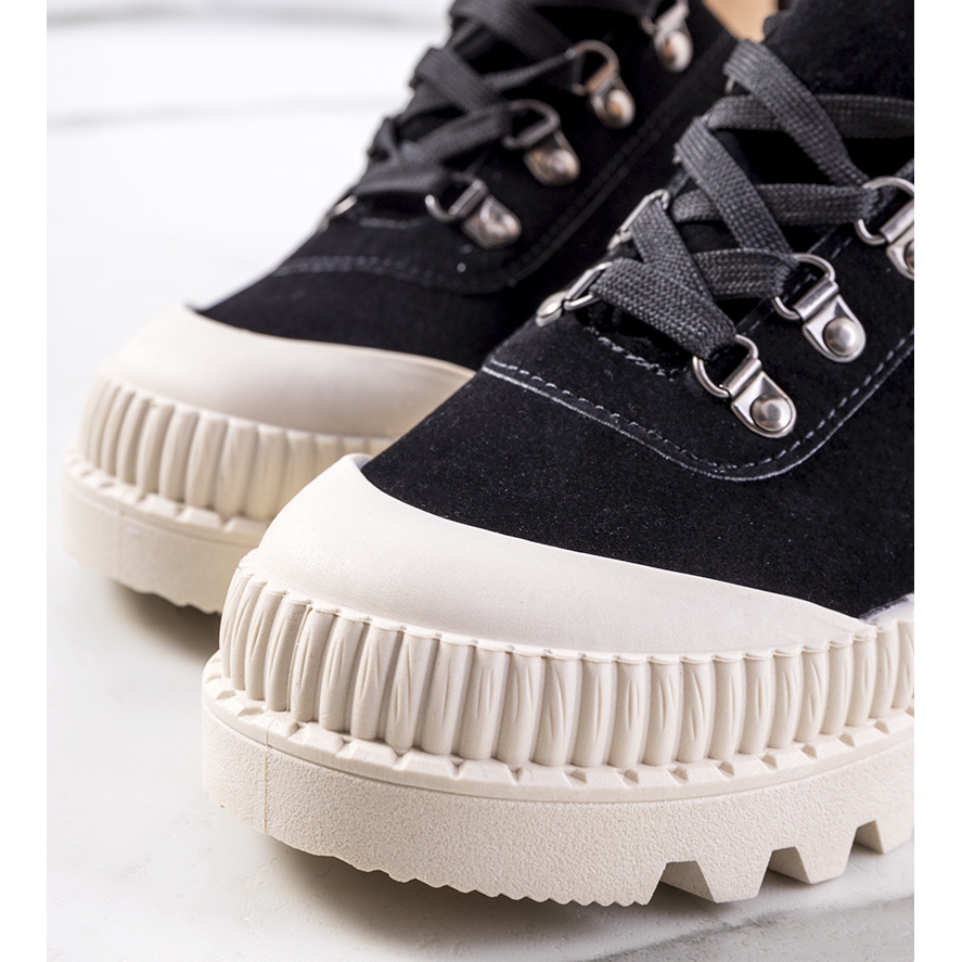 Os calçados chegam acima do tornozelo, o que os faz combinar perfeitamente não só com estilos esportivos, de agasalho, mas também com vestidos românticos. A sua cor preta universal torna-os fáceis de combinar com vários itens de guarda-roupa.